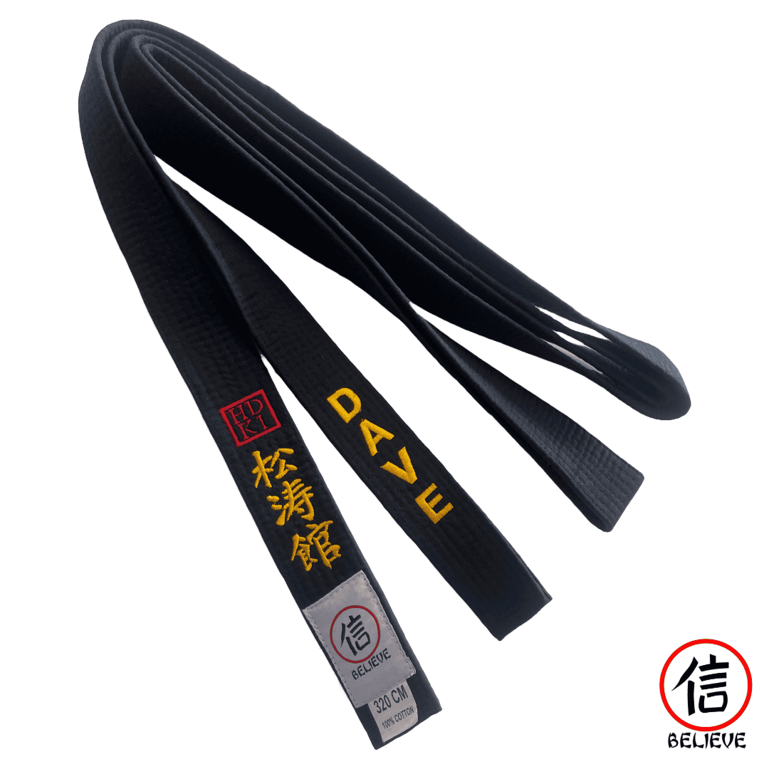 Custom - Club Name and Badge, Personal Name and Dan Bar Embroidered on 100% Cotton Black Belts. Customise yours!
